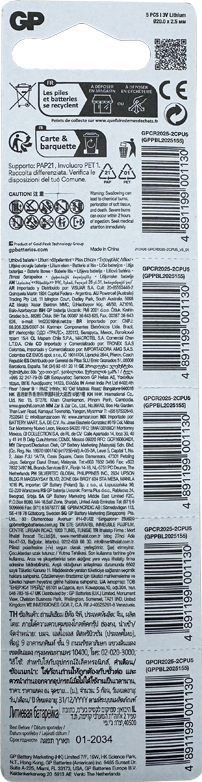 GP CR2025-C5, Çin menşeli ve yüksek kalite standartlarına sahip bir lityum düğme pilidir. Özellikle küçük elektronik cihazlar ve saatler için uygundur. Temel özellikleri şunlardır:Model Kodu: CR2025